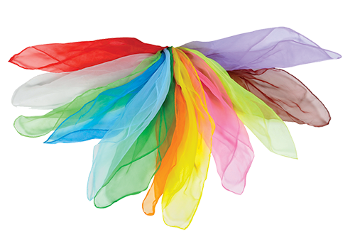 This set includes twelve 27” hemmed square movement scarves in twelve assorted colors. These versatile and durable scarves can be used to highlight flowing movement, for juggling, and tossing them up in the air while dancing to your favorite Music Together songs. To make a wonderful “flower,” wad a scarf up in your hand to form a bud and then slowly open your hand to watch it blossom. Made of 100% nylon. Single scarf color will vary. Please note: Movement props are not toys; they are to be used under adult supervision.